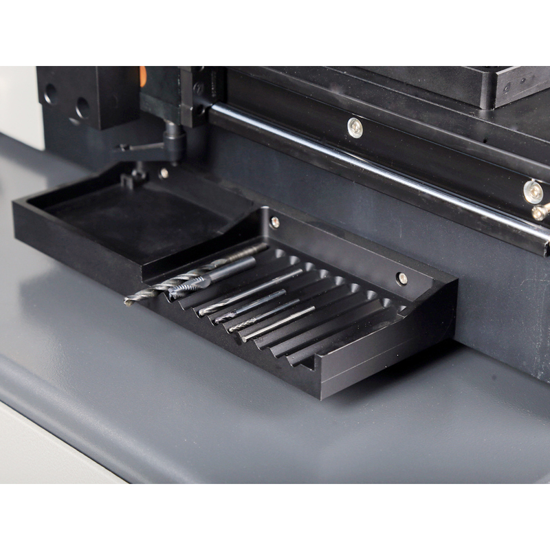 The system features a solid standing workstation with practical storage space and an integrated multi-section tool holder for organized tool preparation.